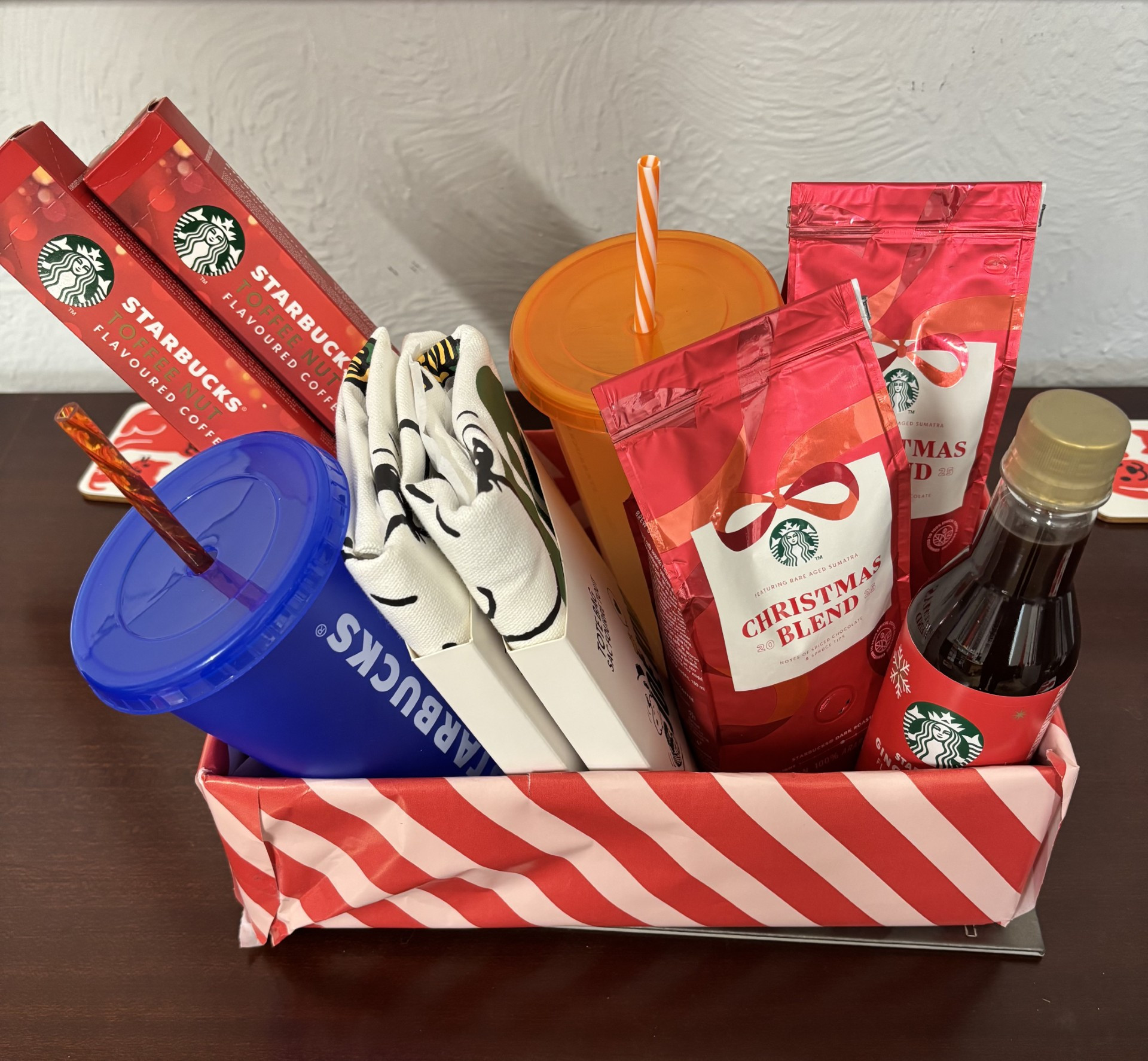 Starbucks Hamper with coffee, flavoured coffee, syrup , cups and tote bags